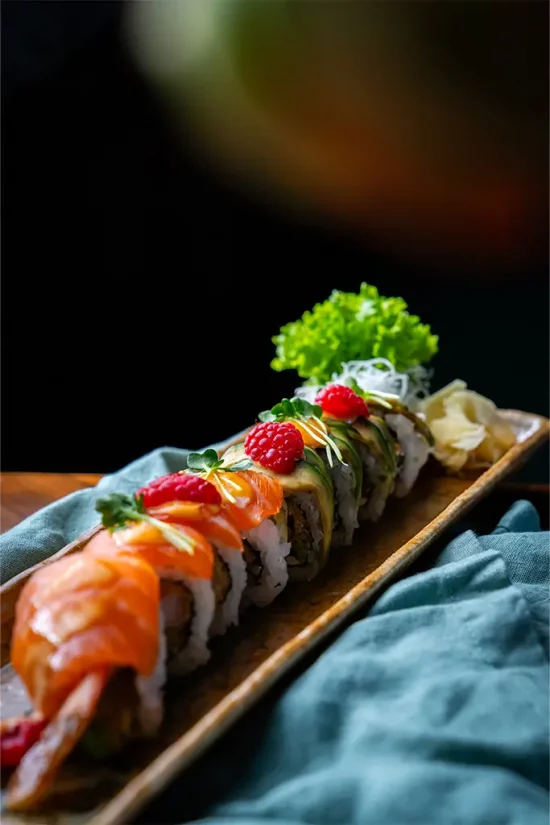9,50 €Tempuragarnelen | Avocado | Mango | garniert mit flambierte Lachs | Sweetsauce & Cocktailsauce
